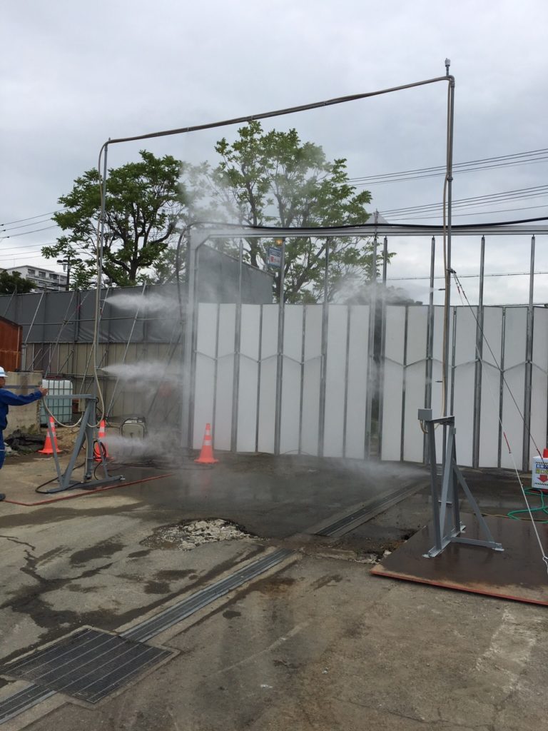 車両湿潤装置 その他関連商品 2021.09.10 近年、都市内の工事現場では近隣への安全・環境対策が重要な課題になっております。弊社では工事会社様と共に協議、開発を重ね、各現場に即応した製品を納入、設置しております。1例が上記の車両湿潤装置です。運搬車両からの砂塵の飛散を防止しています。センサーにより車両の通過時のみ水を噴出します。